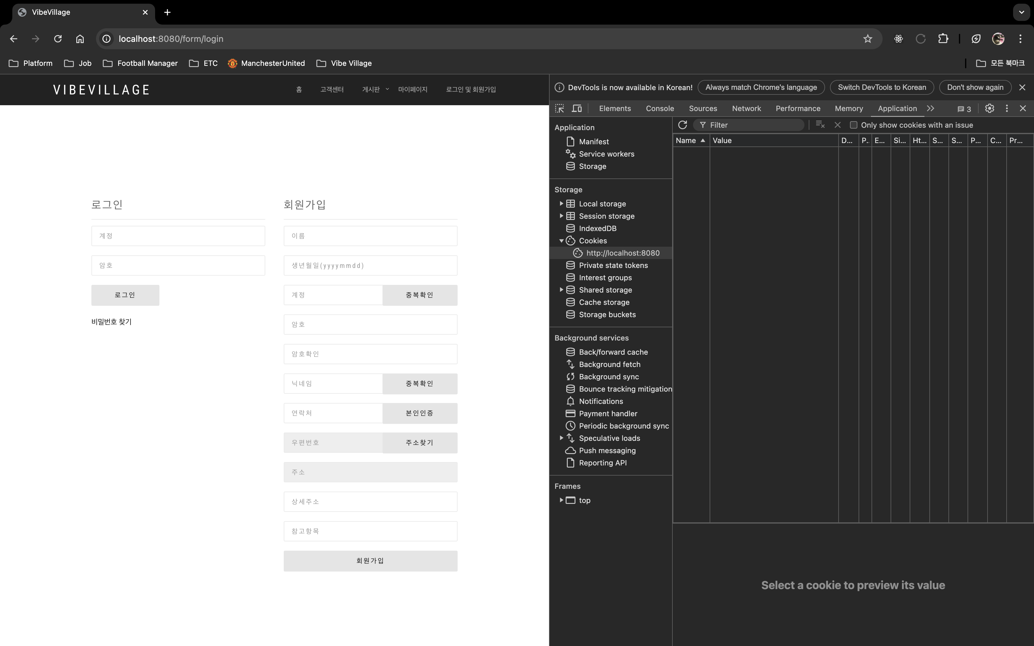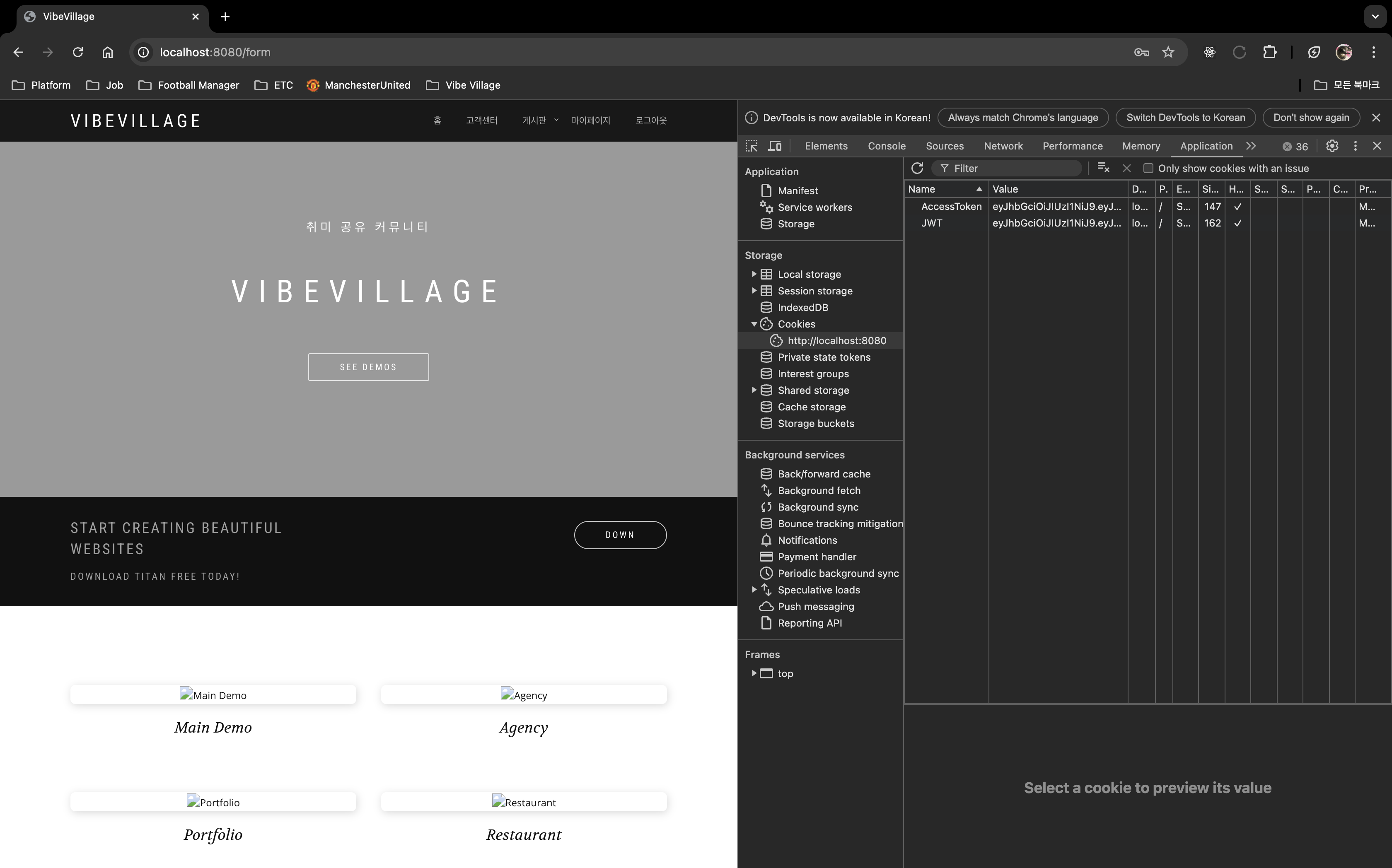 로그인하고 나면 개발자도구 > 네트워크 > 쿠키 배너에 쿠키가 생성되고 그 안에 토큰이 생성되어 있는 것을 확인할 수 있다. 그리고 로그인 완료되고 나서 메인 페이지로 이동도 잘 된다. 시행착오도 많고 우여곡절 많았지만 얼른 기능을 구현해야 한다는 집념 때문에 발생했던 오류와 수정과정을 하나도 기록하지 못했다. 기능 구현을 하면서 포스팅하는 습관을 들여야겠다.... 다음 포스팅에는 로그인, 로그아웃 기능의 부가적인 기능(로그인하고 나면 로그인 버튼이 로그아웃으로 바뀌는 기능, 다른 팀원들이 회원 정보를 추출하여 활용할 수 있는 기능)에 대해 작성해 보도록 하겠다.
