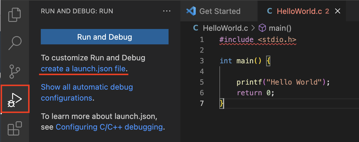 이 작업을 하지 않으면 디버깅 배너를 클릭했을 때 아래와 같이 뜬다. (create a launch.json file 이라는 문구가 보여야 한다.)