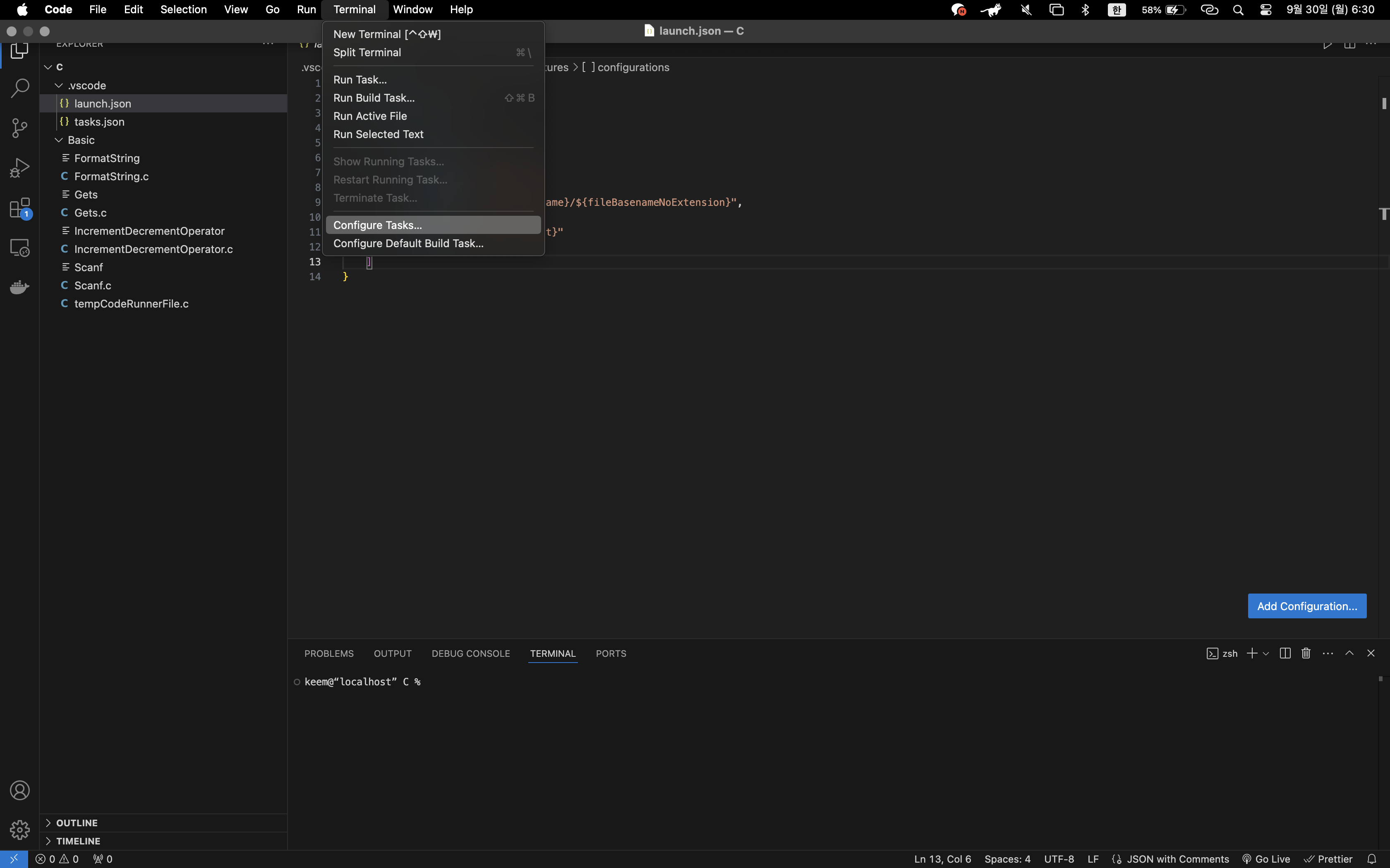 Visual Studio Code 상단에 Terminal 배너에서 Configure Tasks ... 를 선택한다.