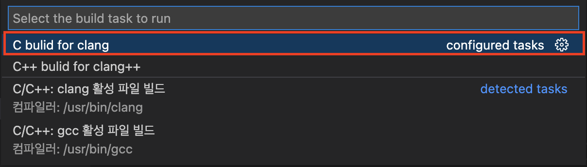 이제 진짜 다 왔다. 조금만 힘내자. Command + shift + b를 눌러 빌드를 실행해 보자. C언어로 실행할 것이니, C build for clang을 선택해 준다.