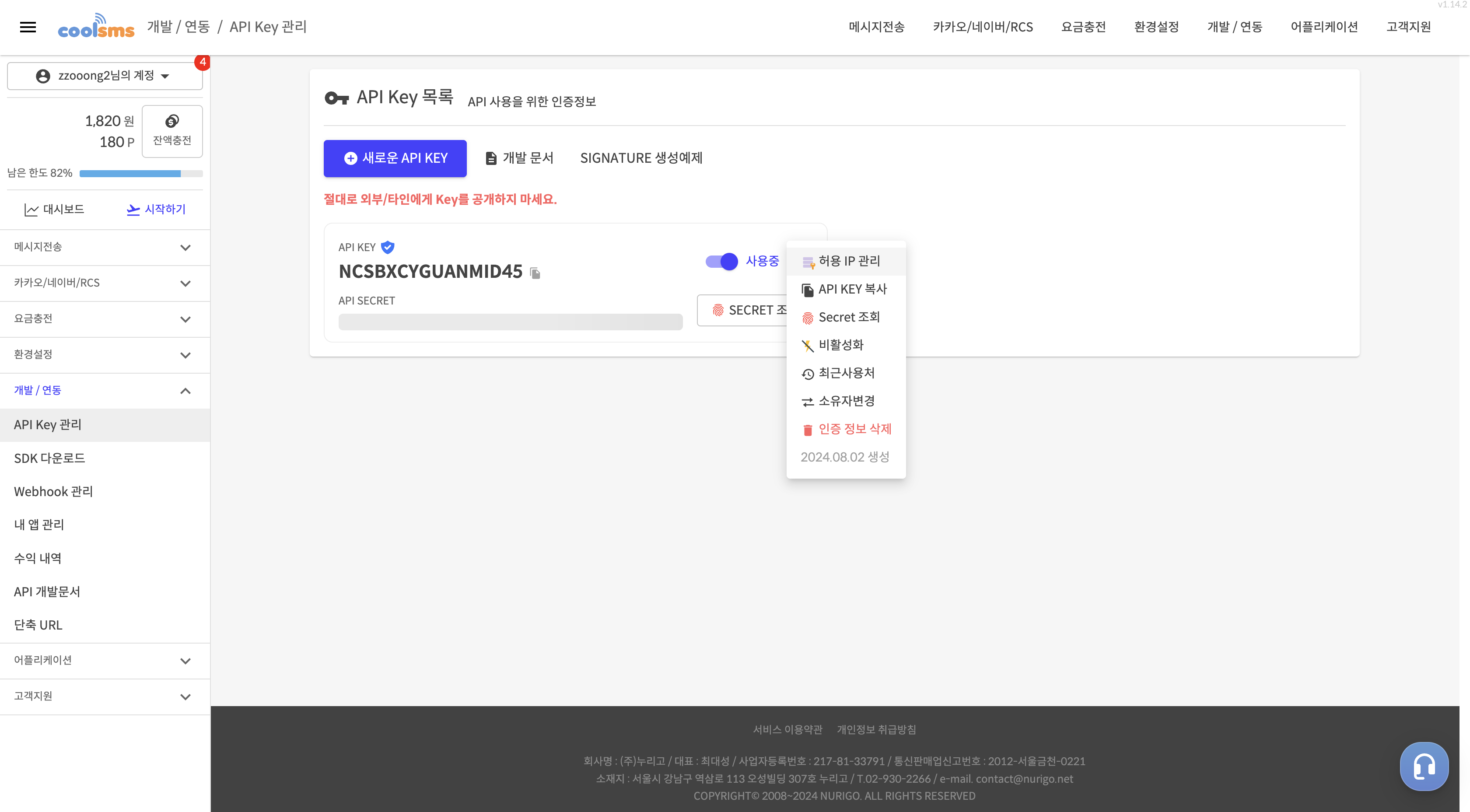 재능 공유, 경험 공유, 중고거래 장터 이용 등 팀 프로젝트 컨셉에 따라 회원가입을 할 때 본인에 대한 인증이 필수다. 개인 연락처를 입력하게 하고 인증번호를 전송하여 확인을 통해 본인 인증을 하는 방식을 선택했다. 문자 인증 API를 찾아보고 제일 저렴하고 레퍼런스(기술 블로그)가 많은 coolSMS를 선택하였다. 사이트에 접속하여 회원가입을 하고 개발/연동 배너에서 API key를 생성한다. 시뻘건 글씨로 안내되고 있듯 key는 절대로 외부에 공개되면 안 된다.