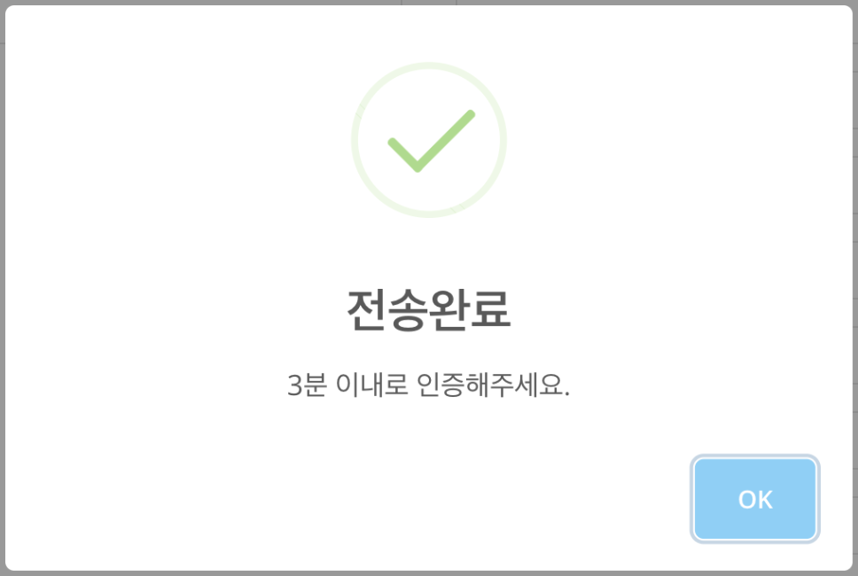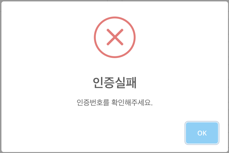 인증요청을 하고 나서 3분(180초) 이내에 인증을 해야 하며 다른 인증코드를 입력하면 아래와 같이 alert 창이 뜬다.