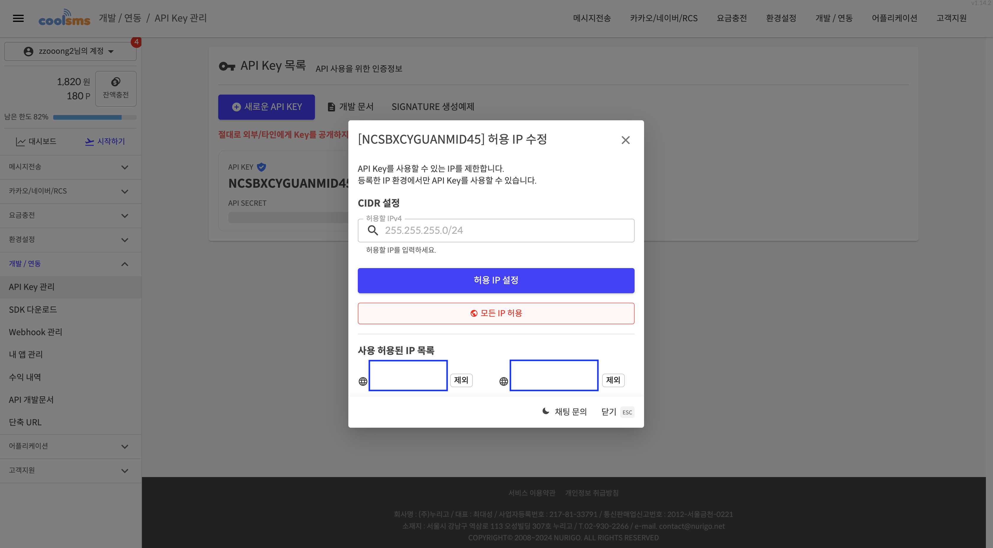 API key를 생성하고 IP 주소를 관리해주어야 한다. API key와 마찬가지로 아무나, 누구나 사용할 수 없게 설정하는 것 같다. 생성된 API key의 우측 상단에 점 3개를 누르면 허용 IP 관리 배너가 보인다. 클릭해 주고...